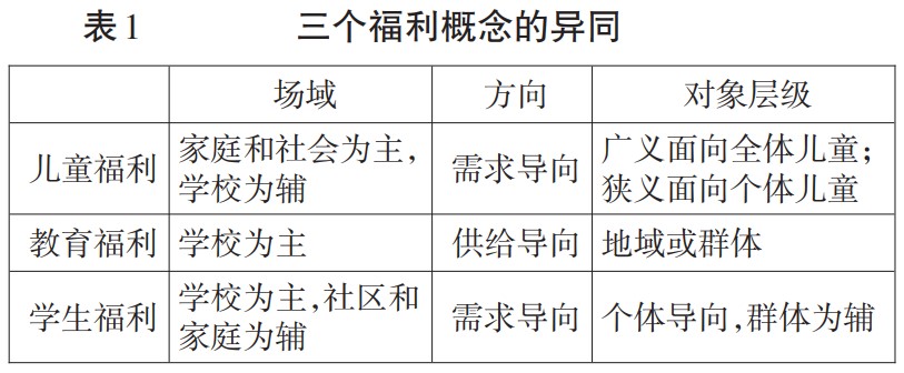 討論學(xué)生福利安全網(wǎng)之前,應(yīng)將其與兒童福利和教育福利進(jìn)行區(qū)分,這種區(qū)分也是對學(xué)生福利價值的說明。(見表 1)