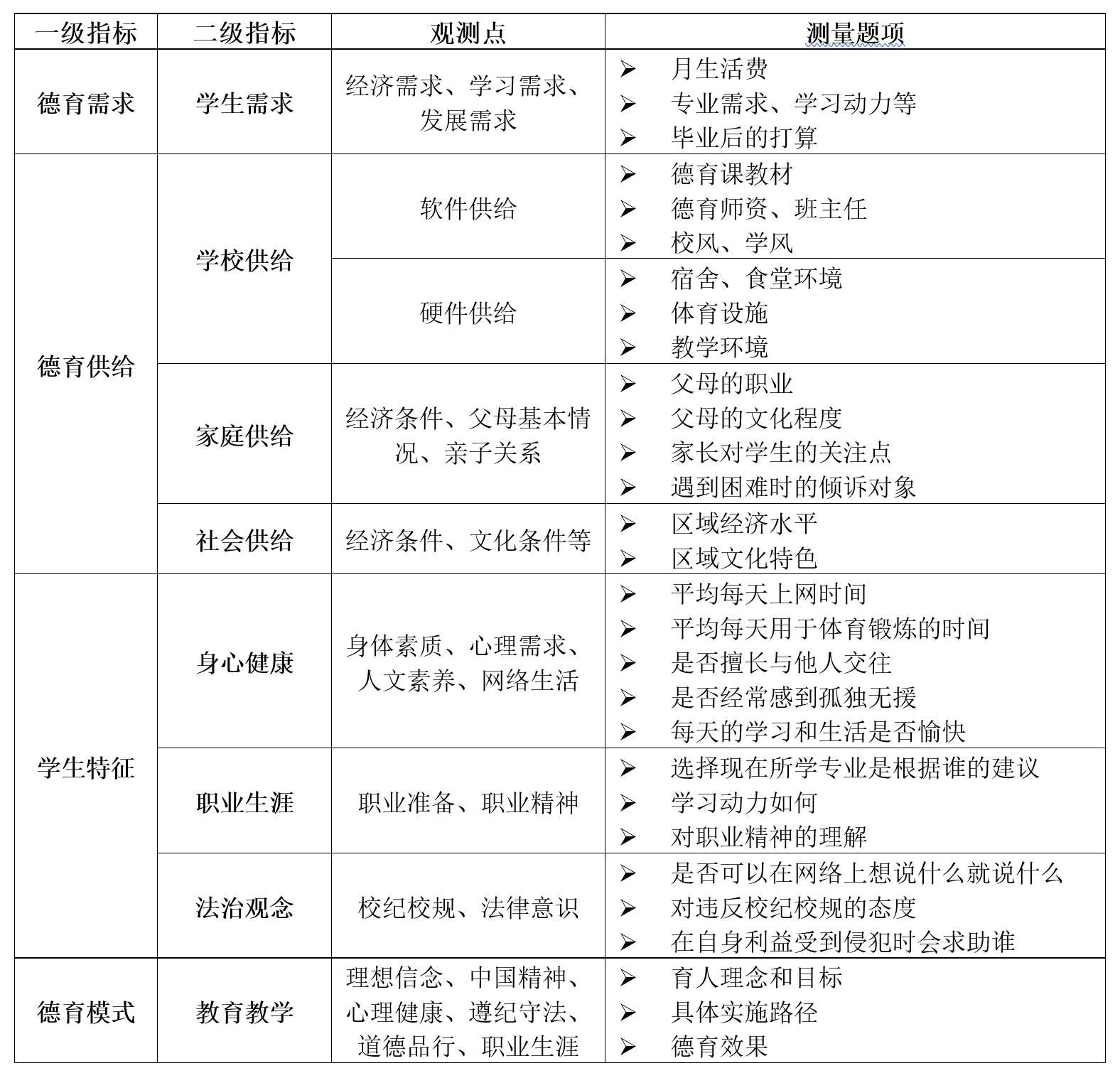 隨著經(jīng)濟(jì)全球化進(jìn)程的不斷推進(jìn),區(qū)域逐漸作為獨(dú)立的經(jīng)濟(jì)單元參與到國(guó)際競(jìng)爭(zhēng)中,中職學(xué)生也面臨著更加復(fù)雜的社會(huì)思潮和嚴(yán)格的崗位要求。因此,對(duì)中職學(xué)校德育區(qū)域特征的研究應(yīng)更加全面、系統(tǒng)、有針對(duì)性。本研究基于最新政策文件要求,聚焦時(shí)代主題,圍繞《中等職業(yè)學(xué)校德育大綱(2014年修訂)》核心內(nèi)容,以區(qū)域特征為研究重點(diǎn),從德育需求、德育供給、學(xué)生特征、德育模式等幾個(gè)方面構(gòu)建了研究框架,有效涵蓋了中職學(xué)校德育的主要內(nèi)容,旨在全面呈現(xiàn)區(qū)域特征(本研究所使用測(cè)量題項(xiàng)具體如下表所示:)