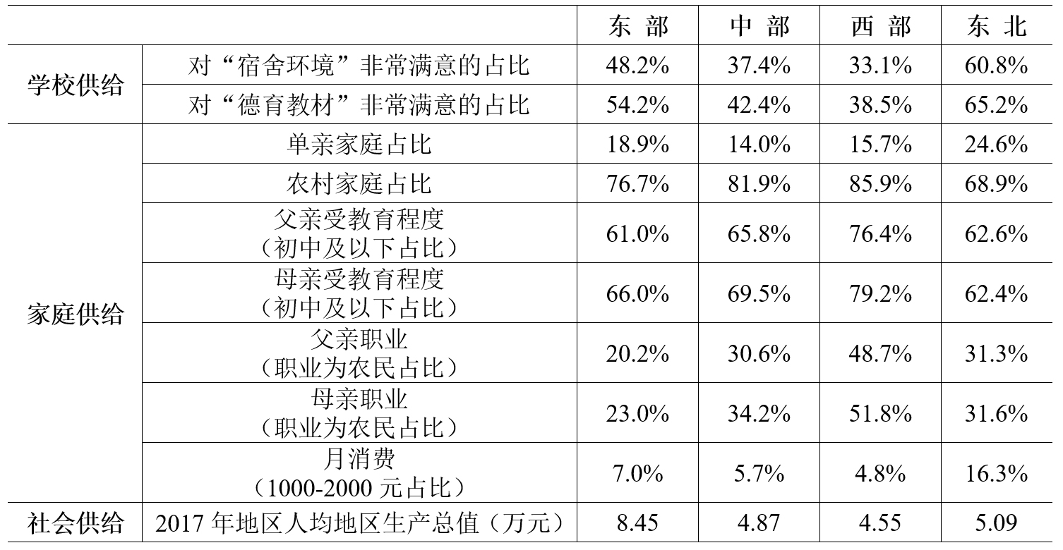 缺少數(shù)量充足、水平過(guò)硬的德育課專(zhuān)業(yè)教師和高質(zhì)量的德育教材是中西部地區(qū)面臨的棘手問(wèn)題。調(diào)查顯示,東部地區(qū)對(duì)德育課非常滿(mǎn)意的學(xué)生為53.9%,西部地區(qū)僅為38.1%。此外,學(xué)校的硬件條件也大相徑庭。以學(xué)生對(duì)宿舍環(huán)境的評(píng)價(jià)為例,東北地區(qū)選擇“非常滿(mǎn)意”比例為60.8%,西部地區(qū)僅為33.1%。從家庭供給看,情況更加復(fù)雜,東北地區(qū)來(lái)自單親家庭的學(xué)生比例和西部地區(qū)父母受教育程度偏低家庭的學(xué)生比例顯著高于其他區(qū)域。數(shù)據(jù)顯示,東北地區(qū)中職學(xué)生單親家庭比例高達(dá)24.6%,西部地區(qū)農(nóng)村家庭的占比達(dá)85.9%。原生家庭的缺陷在很大程度上導(dǎo)致了家庭教育的缺失,因此學(xué)校和社會(huì)的德育任務(wù)更加艱巨。從社會(huì)供給看,主要受制于區(qū)域經(jīng)濟(jì)差距和文化差異。2017年,我國(guó)東中西和東北地區(qū)人均地區(qū)生產(chǎn)總值分別為8.45萬(wàn)元、4.87萬(wàn)元、4.55萬(wàn)元和5.09萬(wàn)元,經(jīng)濟(jì)差距顯而易見(jiàn)。雄厚的地方財(cái)政既可以保障學(xué)校的必要投入,吸引和培養(yǎng)優(yōu)質(zhì)師資,也可以為學(xué)生提供學(xué)習(xí)和就業(yè)的產(chǎn)業(yè)基礎(chǔ)。此外,區(qū)域文化也是影響供給的重要因素。目前,東北和中西部地區(qū)的家長(zhǎng)觀念和意識(shí)還比較陳舊,對(duì)入讀職業(yè)院校孩子的未來(lái)充滿(mǎn)擔(dān)憂(yōu)。而東部地區(qū)的觀念更加開(kāi)放和包容,特別是沿海發(fā)達(dá)城市家長(zhǎng)多數(shù)認(rèn)可通過(guò)學(xué)習(xí)一技之長(zhǎng)也可以實(shí)現(xiàn)人生出彩。