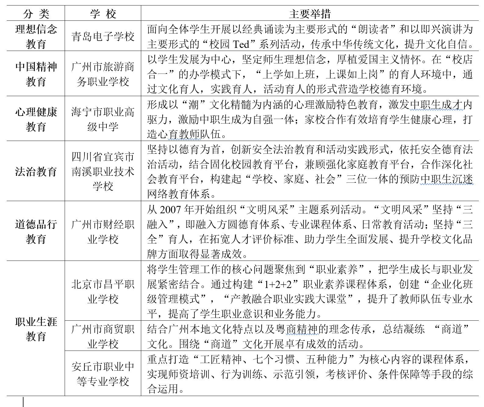 在實(shí)踐中,中職學(xué)校充分發(fā)揮區(qū)域比較優(yōu)勢(shì),走出了德育工作的新道路、創(chuàng)新了德育工作模式,在理想信念教育、中國(guó)精神教育、心理健康教育、法治教育、道德品行教育、職業(yè)生涯教育方面不斷探索、推陳出新。例如,青島電子學(xué)校在理想信念教育方面進(jìn)行了有益的嘗試,將國(guó)際性的公共演講TED(technology, entertainment, design)的理念引起學(xué)校,創(chuàng)造了“校園TED”,通過(guò)充滿(mǎn)挑戰(zhàn)和趣味的活動(dòng)傳遞教育理念。廣州市旅游商務(wù)職業(yè)學(xué)校將堅(jiān)定師生理想信念、厚植愛(ài)國(guó)職業(yè)情懷作為辦學(xué)理念,并將其貫穿在育人全過(guò)程中。海寧市職業(yè)高級(jí)中學(xué)開(kāi)展心理激勵(lì)特色教育,開(kāi)展家校合作,打造心育教師隊(duì)伍,通過(guò)激發(fā)學(xué)生內(nèi)驅(qū)力扭轉(zhuǎn)學(xué)生自卑心理,有效提升了心理健康教育實(shí)效。四川省瀘縣建筑職業(yè)中專(zhuān)學(xué)校實(shí)現(xiàn)了德育工作與法治教育的高度融合,學(xué)校的德育工作根據(jù)其學(xué)生個(gè)體特殊性而具體展開(kāi),堅(jiān)持全員德育,構(gòu)建學(xué)校德育教育規(guī)范化運(yùn)行模式,將法治教育貫穿教育過(guò)程。廣州市財(cái)經(jīng)職業(yè)學(xué)校高度重視道德品行教育,通過(guò)“文明風(fēng)采”主體系列活動(dòng)打造德育品牌,形成了集課程、活動(dòng)、評(píng)價(jià)為依托的一體化育人模式。北京市昌平職業(yè)學(xué)校積極開(kāi)展理論探索,明確了“職業(yè)素養(yǎng)”教育要解決的問(wèn)題,并從職業(yè)素養(yǎng)課程體系改革入手,創(chuàng)造“企業(yè)化班級(jí)管理”模式,建立了“產(chǎn)教融合”職業(yè)實(shí)踐大課堂,將職業(yè)素養(yǎng)融入學(xué)生實(shí)踐全過(guò)程。廣州市商貿(mào)職業(yè)學(xué)校將校園文化與粵商文化共融,實(shí)現(xiàn)了制度建設(shè)固本強(qiáng)基。安丘市職業(yè)中等專(zhuān)業(yè)學(xué)校通過(guò)打造核心培養(yǎng)內(nèi)容課程體系、創(chuàng)新職業(yè)核心素養(yǎng)培養(yǎng)模式、構(gòu)建中職德育教育創(chuàng)新模式、建立職業(yè)核心素養(yǎng)評(píng)價(jià)體系等方式實(shí)現(xiàn)人才培養(yǎng)與職業(yè)人標(biāo)準(zhǔn)的有效對(duì)接。