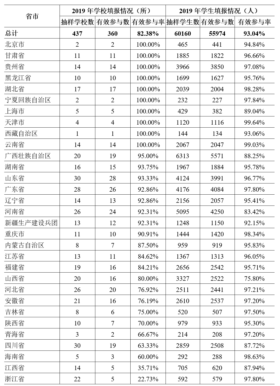 本次調(diào)查的有效參與對(duì)象主要涉及全國31個(gè)省(自治區(qū)、直轄市)的360所中職學(xué)校和55974位中職學(xué)生。其中,2019年和2017年兩輪調(diào)查均參加的樣本校為333所,為持續(xù)跟蹤調(diào)查提供了穩(wěn)定數(shù)據(jù)。本次調(diào)查研究對(duì)象分布和參與情況見表1。