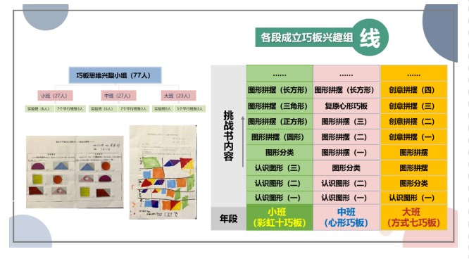 連成興趣線。 根據(jù)不同年齡段幼兒圖形認(rèn)知能力發(fā)展特點及規(guī)律,園內(nèi)在各年齡段成立巧板興趣小組,設(shè)計系列“巧板挑戰(zhàn)書”,螺旋遞進(jìn)式呈現(xiàn)巧板拼擺的任務(wù),并參照幼兒現(xiàn)階段巧板拼擺的水平,實時更新活動任務(wù),來幫助小朋友鞏固游戲操作經(jīng)驗。同時,通過每周一到周四發(fā)布挑戰(zhàn)任務(wù)和每月組織各年齡段開展巧板PK賽,激發(fā)幼兒參與巧板拼擺活動的興趣。