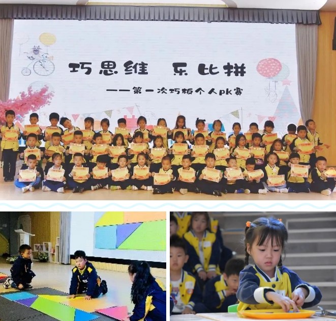 該園以“巧板類思維活動對幼兒圖形思維能力培養(yǎng)”為研究主題,根據(jù)幼兒年齡配備不同種類的巧板材料,在兼具趣味性、層次性和挑戰(zhàn)性的游戲活動中,培養(yǎng)幼兒的形狀概念、認(rèn)知技巧、視覺記憶、手眼協(xié)調(diào)、觀察力和想象力,從而促進(jìn)幼兒圖形思維能力的發(fā)展。截止目前,通過約2年的實踐,義烏市新絲路學(xué)校附屬幼兒園已逐步形成了教師研訓(xùn)、幼兒活動、家園共育三位一體的課程實踐新模式。