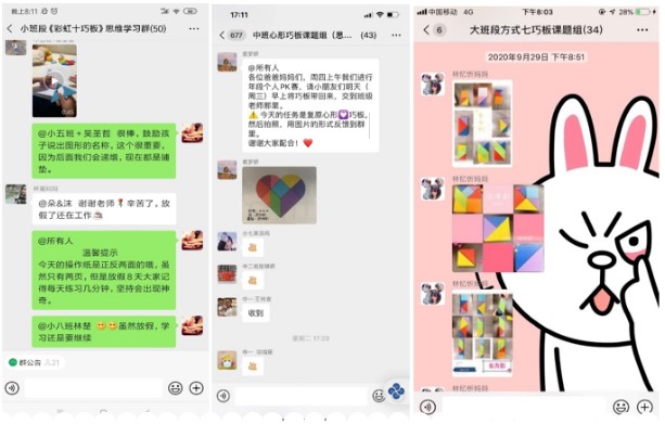 除此,該園也會以思維活動材料為載體,抓住開展“游戲化思維活動課程”的契機,不定期組織家長PK賽,調(diào)動其參與思維游戲活動的積極性。在開展活動后,教師不僅看到了家長們的變化,更受到了大量的的暖心反饋。家長們紛紛表示:孩子玩巧板的時間多了,看電視的時間少了,家長陪孩子的時間多了,親子之間的感情增進(jìn)了,這些都離不開幼兒園的付出和家長的配合。