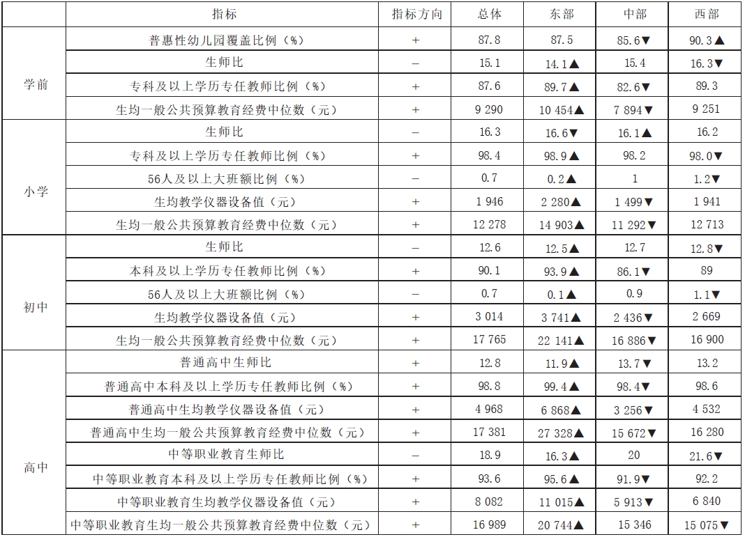 具體而言,在學前教育階段,中部地區(qū)多項指標明顯低于東部和西部地區(qū)。普惠性幼兒園覆蓋比例在東中西部地區(qū)的比例分別為87.5%、85.6%和90.3%。造成上述現(xiàn)象的原因是西部地區(qū)受益于政府的重點投入與扶持,政策影響效應強,學前教育近年來發(fā)展迅速,但中部地區(qū)人口規(guī)模較大,政策效應弱,陷入先天不足而后天乏力的窘境。??萍耙陨蠈W歷專任教師比例在三個區(qū)域分別為89.7%、82.6%和89.3%。中部地區(qū)生均一般公共預算教育經(jīng)費中位數(shù)為7894元,僅相當于東部地區(qū)的75.5%,西部地區(qū)的85.3%。
