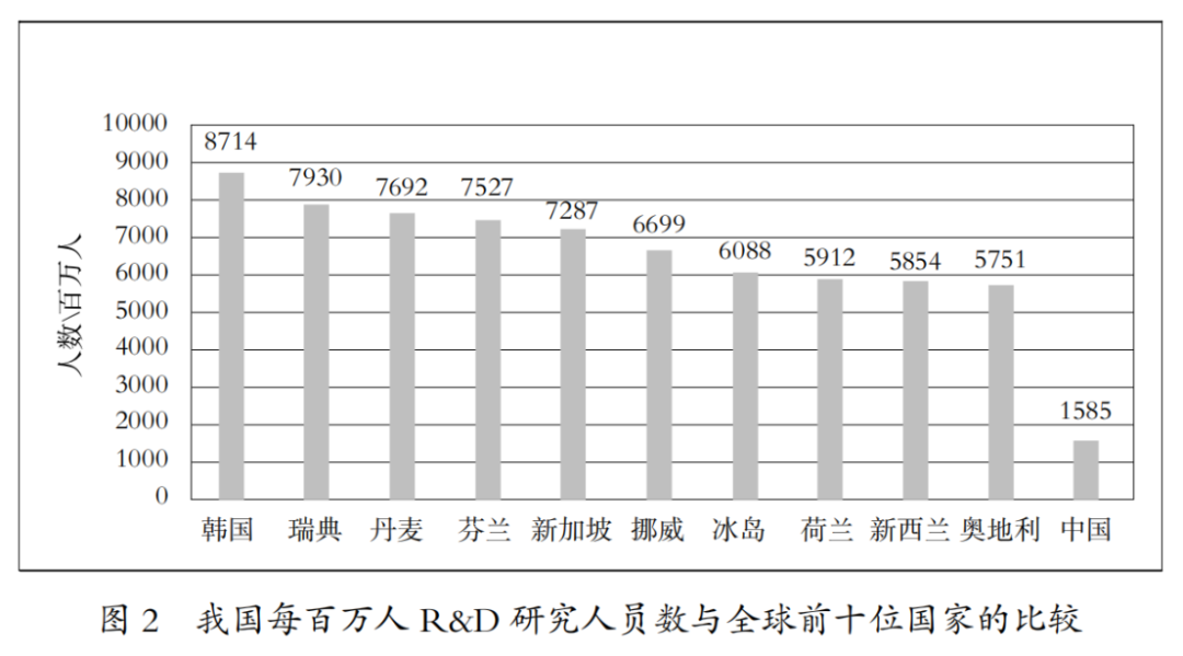 “十三五”期間,我國R&D(研究與試驗發(fā)展)人員全時當量①快速增長,年均增速超過7%,從2016年的387.8萬人增長到2020年的509.2萬人,連續(xù)多年位居世界第一,凸顯了我國科技研發(fā)工作人員突出的絕對規(guī)模優(yōu)勢。但是,我國高層次科技研發(fā)人員占人口比重相較一些創(chuàng)新強國差距明顯。據(jù)世界銀行2022年6月最新數(shù)據(jù),各國每百萬人中R&D研究人員②比重最高的是韓國,為8714人,其他前十位國家依次是瑞典(7930人)、丹麥(7692人)、芬蘭(7527人)、新加坡(7287)、挪威(6699)、冰島(6088人)、荷蘭(5912人)、新西蘭(5854人)和奧地利(5751人);中國在有統(tǒng)計數(shù)據(jù)的國家和地區(qū)中排在第51位,每百萬人有1585名R&D研究人員,僅相當于瑞典的1/5(見圖2)。