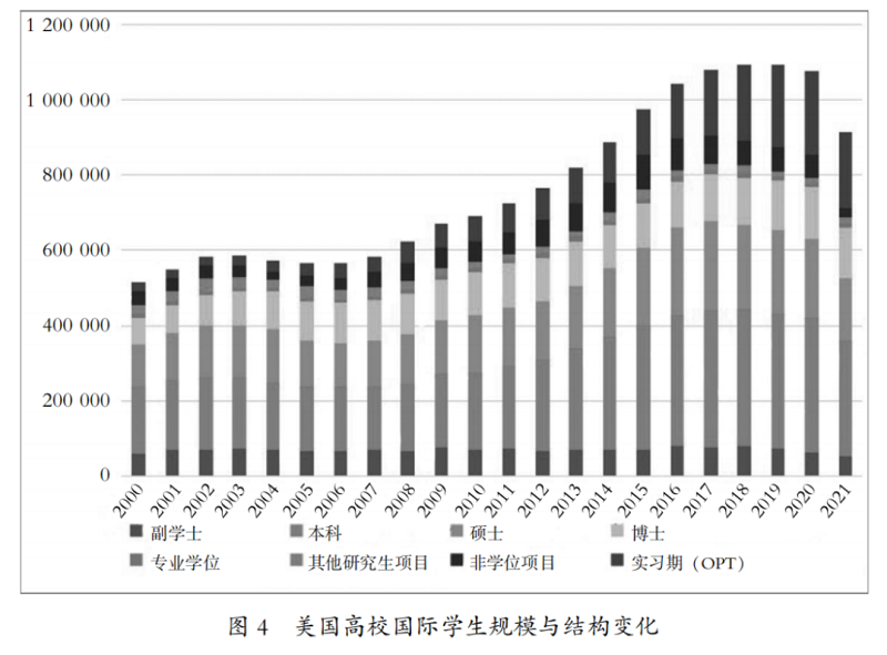 美國歷年諾貝爾獎得主很大比例是移民;20世紀80至90 年代,印裔和華裔技術移民占據(jù)美國科技公司工程師及創(chuàng)業(yè)者群體的1/3;當前美國大約60%最具價值的科技公司由外來移民及其子女創(chuàng)立。美國擁有最多世界一流大學,是全球最大留學目的國,2000年以來,各層次留學生規(guī)模穩(wěn)步增長,2019年達到頂峰(見圖4)。科學和理工技術(STEM)領域高層次留學生很大比例繼續(xù)留在美國,2016 年美國工程專業(yè)、數(shù)學與計算機科學博士學位獲得者中,持有臨時簽證的比例超過一半。