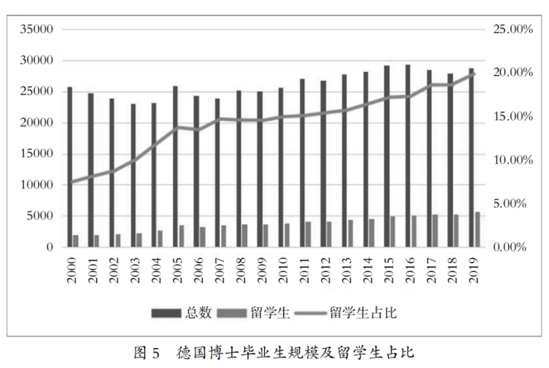 二是定向吸引高層次科研后備人才。博士層次特別是STEM學科的留學生對英法德三國而言是重要的科技儲備人才,三國都通過獎學金、崗位聘任等多種方式,面向全球招募博士生。法國博士生群體中外籍學生占比超過40%;2000—2019年,在德國獲得博士學位的留學生數(shù)量從1926人增至5688人,在全部博士畢業(yè)生中占比從7%上升至20%(見圖5)。英國2020年發(fā)布《英國研究與發(fā)展路線圖》,推出 “全球人才簽證”,允許高水平科學家和研究人員無須工作邀請就可獲得英國移民簽證,并延長留學生畢業(yè)后在英居留時間。