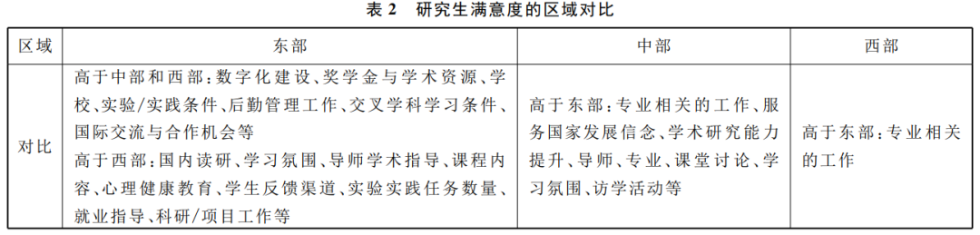 區(qū)域教育發(fā)展的不平衡是我國教育事業(yè)發(fā)期存在的問題,也是國家一直想解決的問題。調(diào)查顯示,研究生教育滿意度在區(qū)域之現(xiàn)著差異,整體呈現(xiàn)高西低的狀態(tài),其中部高校的研究生滿意度高的選項最多,主要體現(xiàn)于其學校的硬條件與滿意度高;其次中部高校,尤其是對專業(yè)、教、服務(wù)信念的成效可高;西部高校研究生的滿意度大部分都著低于中部和部。表2 研究生滿意度的區(qū)域比情況。