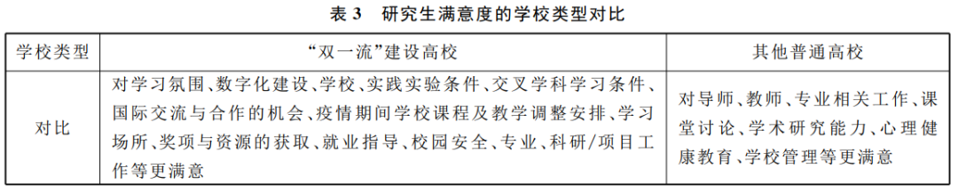 一流人才是雙一流設(shè)的核心,特是拔尖創(chuàng)新人才的培養(yǎng),而拔尖創(chuàng)新人才的培養(yǎng)主要在于研究生教育段。當下,各層級雙一流設(shè)正在如火如荼地開展,各政府、高校都投入了大量人力、物力、力建設(shè)一流大學和一流學科。本研究發(fā)現(xiàn),在雙一流設(shè)高校就的研究生與其他高校研究生滿意度存在著差異,整體上雙一流設(shè)高校學生滿意度高。表3研究生滿意度的學校比情況。