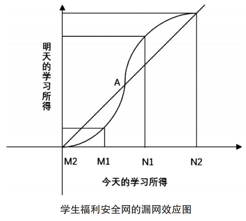義務(wù)教育階段是人生第一個同齡全員參與的、正式社會化和接受評價比較的階段,義務(wù)教育階段的掉隊足以影響學(xué)生一生的狀態(tài)。學(xué)生福利漏網(wǎng)所產(chǎn)生的效應(yīng)與貧困陷阱的效應(yīng)類似(見下圖)。Y 軸為學(xué)生明天的發(fā)展?fàn)顟B(tài),X 軸為學(xué)生今天的發(fā)展?fàn)顟B(tài),對角線為今天的學(xué)習(xí)所得等于明天的學(xué)習(xí)所得,N1 點的學(xué)生群體明天學(xué)習(xí)所得預(yù)計超過今天學(xué)習(xí)所得并發(fā)展越來越好,預(yù)期能進(jìn)展到N2 點;低于對角線的學(xué)生知識儲備薄弱,雖然也學(xué)到新東西,但學(xué)得少,與跑在前面的學(xué)生差距逐漸拉大。更重要的是,明天所學(xué)的內(nèi)容和難度在一定程度上由跑在前面的大部分學(xué)生決定,當(dāng)學(xué)生位于曲線 A 點以下,今天所得無法支撐明天的學(xué)習(xí),學(xué)業(yè)失敗和輟學(xué)風(fēng)險增大,M1 點的學(xué)生就會滑到 M2 點,直到無法繼續(xù)學(xué)校生涯。A 點可以是學(xué)生人生的突發(fā)重大負(fù)面事件,也可以是日常累積負(fù)面因素的爆發(fā),如知識鏈斷裂、人際關(guān)系沖突、心理問題,等等。學(xué)生福利安全網(wǎng)的作用是要在學(xué)生降落到 A 點之前就開展干預(yù),讓學(xué)生能夠保持在 A 點之上完成學(xué)習(xí)目標(biāo)和學(xué)習(xí)任務(wù) 。