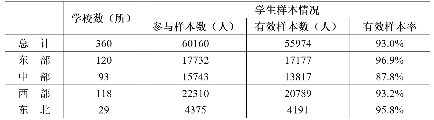 為持續(xù)跟蹤我國(guó)中職學(xué)生的發(fā)展?fàn)顩r特別是德育情況,中國(guó)教育科學(xué)研究院受教育部職成司委托于2019年開(kāi)展了第四次全國(guó)中職學(xué)生發(fā)展?fàn)顩r調(diào)查。本次調(diào)查主要采取網(wǎng)絡(luò)填報(bào)的方式進(jìn)行,在全國(guó)31個(gè)省(自治區(qū)、直轄市)共計(jì)抽取437所學(xué)校,實(shí)際參與調(diào)查的學(xué)校360所,回收問(wèn)卷6萬(wàn)余份,有效問(wèn)卷約5.6萬(wàn)份,有效問(wèn)卷率達(dá)93.0%。從區(qū)域分布看,東部地區(qū)120所學(xué)校參與,有效樣本率96.9%,中部地區(qū)120所學(xué)校參與,有效樣本率87.8%,西部地區(qū)118所學(xué)校參與,有效樣本率93.2%,東北地區(qū)29所學(xué)校參與,有效樣本率95.8%。此外,在網(wǎng)絡(luò)問(wèn)卷和實(shí)地調(diào)研樣本的選取上,綜合考慮了學(xué)校所在區(qū)域、學(xué)校性質(zhì)、學(xué)校類(lèi)型、學(xué)生所在年級(jí)等多重因素,并對(duì)區(qū)域樣本量做出了科學(xué)謀劃,在數(shù)據(jù)層面確保了研究結(jié)論的真實(shí)可靠。