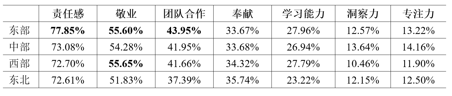 中職學(xué)生將面臨從校園到職場(chǎng)的重要轉(zhuǎn)變,良好的身心狀態(tài)、規(guī)范的言行和科學(xué)的職業(yè)規(guī)劃是成功的必要條件。研究顯示,不同區(qū)域?qū)W生的身心狀態(tài)差異明顯,相關(guān)工作需要差異化的著力點(diǎn)。中西部地區(qū)學(xué)生的心理健康狀態(tài)整體較好,但是身體鍛煉時(shí)間普遍偏低,東北和東部地區(qū)的部分學(xué)生則長(zhǎng)時(shí)間沉迷于網(wǎng)絡(luò),對(duì)身體和心理狀態(tài)均產(chǎn)生了嚴(yán)重的負(fù)面影響。以東部地區(qū)為例,學(xué)生每天上網(wǎng)時(shí)間為1-3小時(shí)的比例高達(dá)33.5%,且內(nèi)容多為娛樂(lè)、游戲等。從遵紀(jì)守法情況看,東部地區(qū)顯著好于其他地區(qū),中部和東北地區(qū)相對(duì)較差,東北地區(qū)的校園欺凌問(wèn)題較為嚴(yán)重,惡性暴力事件屢見(jiàn)不鮮。以東北地區(qū)為例,在自身利益受到侵犯時(shí),近10%的學(xué)生選擇打架反擊,高達(dá)30%的學(xué)生認(rèn)為在網(wǎng)絡(luò)上可以想說(shuō)什么就說(shuō)什么。在職業(yè)準(zhǔn)備方面,東部地區(qū)的學(xué)生更加充分,專(zhuān)業(yè)選擇和發(fā)展規(guī)劃更加清晰明確。但是在職業(yè)精神認(rèn)知方面,各區(qū)域?qū)W生均存在認(rèn)知不足,缺乏系統(tǒng)性的學(xué)習(xí)和理解等問(wèn)題。相比較而言,東部地區(qū)學(xué)生對(duì)責(zé)任感和團(tuán)隊(duì)合作的認(rèn)可度高于其他區(qū)域,西部地區(qū)對(duì)敬業(yè)精神的認(rèn)可度較高。