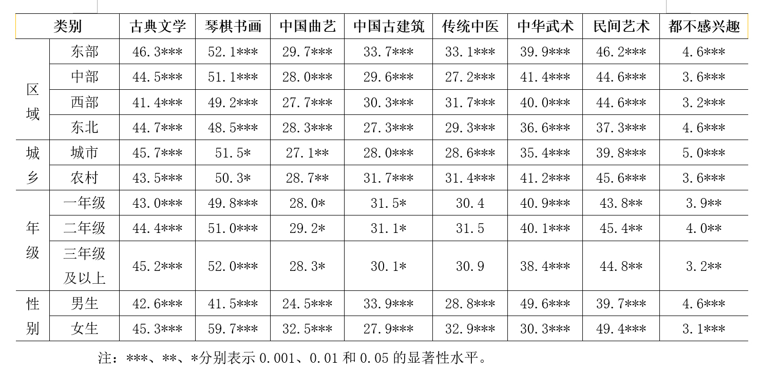 人是具有社會(huì)屬性的,社會(huì)范疇中的經(jīng)濟(jì)、政治、文化等因素會(huì)直接或間接的對(duì)青少年道德品性的養(yǎng)成產(chǎn)生一定影響。在某種程度上,社會(huì)德育環(huán)境對(duì)學(xué)校德育要培養(yǎng)什么樣的人以及怎樣培養(yǎng)人具有決定性作用。研究發(fā)現(xiàn),96.1%的中職學(xué)生對(duì)中華傳統(tǒng)文化表現(xiàn)出濃厚興趣,了解并喜愛中華傳統(tǒng)文化的學(xué)生比2017年提高了1.3個(gè)百分點(diǎn)。通過對(duì)比2017年調(diào)查數(shù)據(jù)發(fā)現(xiàn),中職學(xué)生最喜歡的傳統(tǒng)文化類型均是琴棋書畫,本次調(diào)查中學(xué)生對(duì)各類傳統(tǒng)文化喜歡的比例均大幅增加,都不感興趣的文化比例下降。其中,琴棋書畫(50.5%)、傳統(tǒng)節(jié)日(46.5%)和民間藝術(shù)(44.5%)是最受學(xué)生們喜愛的。具體來看,各區(qū)域?qū)W生、不同年級(jí)學(xué)生均最喜歡琴棋書畫;城市學(xué)生喜歡琴棋書畫,農(nóng)村學(xué)生喜歡傳統(tǒng)節(jié)日;男生最喜歡中華武術(shù),女生最喜歡琴棋書畫(表6)。博大精深的中華優(yōu)秀傳統(tǒng)文化