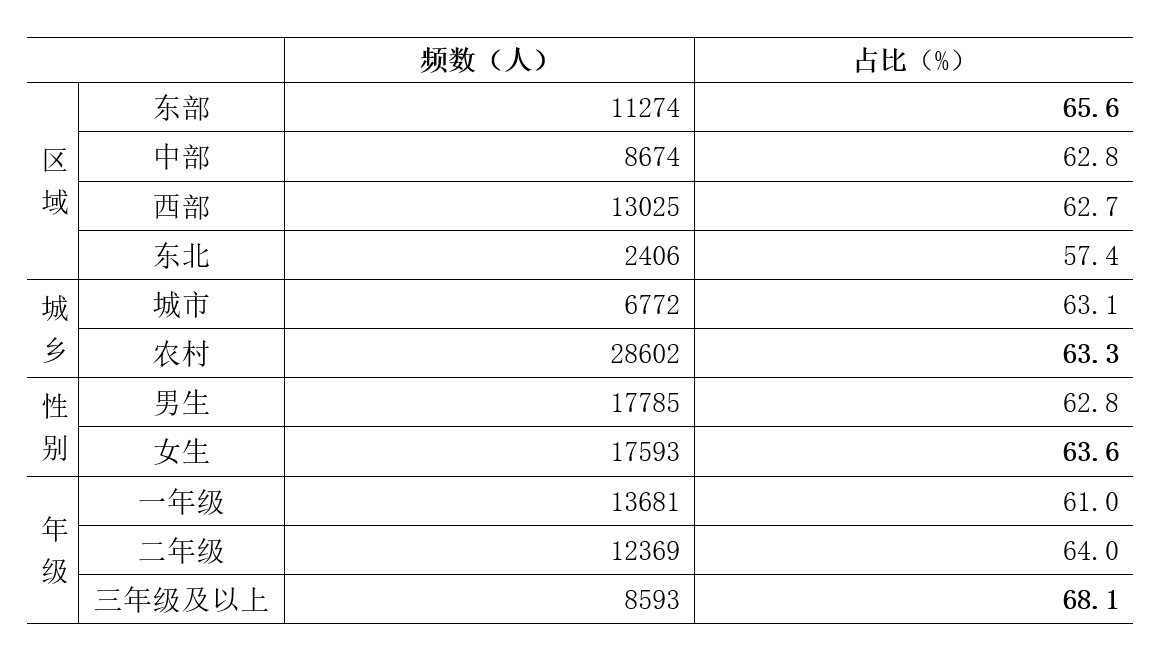 家庭是孩子的第一所學(xué)校,父母是孩子的第一任老師。家庭是培養(yǎng)孩子健康心靈、養(yǎng)成道德行為的重要場(chǎng)域,家庭教育是教育和培養(yǎng)人的基點(diǎn)。家庭教育與學(xué)校教育、社會(huì)教育都是教育系統(tǒng)的重要組成部分,良好的家庭教育既是兒童青少年健康幸福成長的基礎(chǔ),也是培養(yǎng)德智體美勞全面發(fā)展的社會(huì)主義建設(shè)者和接班人的基石。可見,家庭德育環(huán)境對(duì)青少年德性的養(yǎng)成至關(guān)重要。研究發(fā)現(xiàn),家長與子女有效溝通交流頻次增多,學(xué)生能夠經(jīng)常和家長說心里話的比例上升,較2017年調(diào)查(30.5%)提高了0.9個(gè)百分點(diǎn)。在區(qū)域方面,東北地區(qū)學(xué)生與父母溝通交流的比例最高;在城鄉(xiāng)方面,城市學(xué)生與父母溝通交流的比例明顯高于農(nóng)村;在性別方面,男生與父母溝通交流的比例明顯高于女生;在年級(jí)方面,三年級(jí)及以上的學(xué)生與父母溝通交流的比例最高,并且年級(jí)因素與溝通交流頻次之間呈正相關(guān)性(表5)。不僅如此,家長對(duì)孩子教育的關(guān)注點(diǎn)總體上也有了較好的轉(zhuǎn)變,依次排序?yàn)樯硇臓顟B(tài)(29.0%)、學(xué)習(xí)成績(27.4%)、衣食住行(18.6%)、道德品行(17.1%)和就業(yè)前景(6.7%)。由此可見,身心健康逐漸成為家長的首要關(guān)注點(diǎn)。在區(qū)域方面,東部地區(qū)家長關(guān)注子女身心狀態(tài)的比例最高;在城鄉(xiāng)方面,農(nóng)村家長關(guān)注子女身心狀態(tài)的比例略高于城市;在性別方面,女生家長關(guān)注子女身心狀態(tài)的比例明顯高于男生;在年級(jí)方面,三年級(jí)及以上的家長關(guān)注子女身心狀態(tài)的比例相對(duì)較高(表5)。隨著國家經(jīng)濟(jì)高質(zhì)量持續(xù)發(fā)展、科學(xué)技術(shù)日