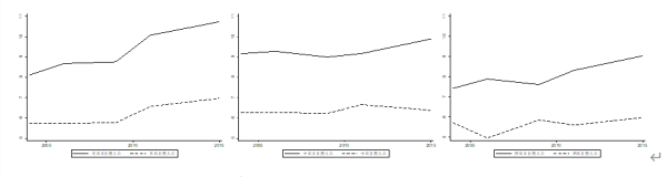 在相對(duì)貧困標(biāo)準(zhǔn)下,如果將城鄉(xiāng)之間受教育水平差異定義為組間差異,將城鎮(zhèn)不同群體之間或者農(nóng)村不同群體之間的差異定義為組內(nèi)差異,則組間差異呈現(xiàn)收斂的趨勢(shì),組內(nèi)差異呈現(xiàn)發(fā)散的趨勢(shì)。(見圖2)
