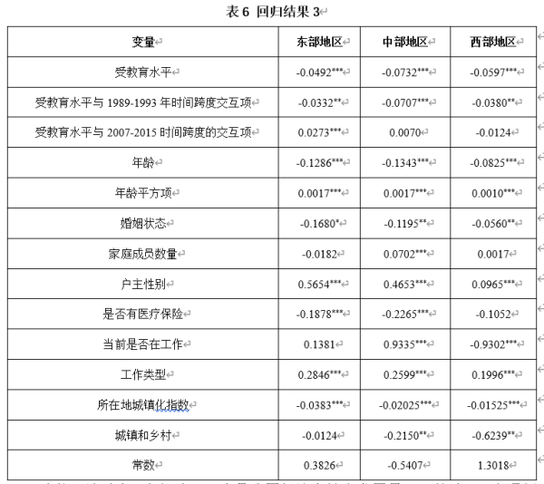 分區(qū)域的回歸結(jié)果顯示,教育對(duì)相對(duì)貧困的改善總體程度上中部最高,西部次之,東部最低。經(jīng)過(guò)計(jì)算,東部地區(qū)三個(gè)時(shí)間階段的系數(shù)分別為-0.0824、-0.0492 和-0.0219(見表6),顯示出遞減的趨勢(shì)。按照同樣的規(guī)則分析,中部地區(qū)前兩個(gè)階段實(shí)際系數(shù)分別為-0.1439和-0.0732,西部地區(qū)前兩個(gè)階段實(shí)際系數(shù)分別為-0.0977和-0.0597,二者均呈現(xiàn)出遞減的趨勢(shì)。而中部和西部地區(qū)最后一個(gè)階段系數(shù)均不顯著,表明與前一階段沒(méi)有顯著差別。(見表6)