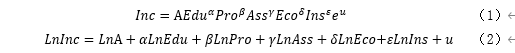 3.模型構(gòu)建:模型為對柯布-道格拉斯生產(chǎn)函數(shù)Y=AL^α K^β e^u進行改進后的雙對數(shù)多元線性模型,采用此模型的主要原因是,雙對數(shù)模型能較好地表示自變量的變化百分比對因變量的變化百分比帶來的影響,即能表示教育投入的變化對農(nóng)民收入變化產(chǎn)生的影響,能從數(shù)量上表明教育扶貧的成效??紤]到居民收入和地區(qū)經(jīng)濟的內(nèi)在聯(lián)系Inc=f(Y),將被解釋變量選為農(nóng)村人均純收入,解釋變量為中央脫貧攻堅“五個一批”提到的脫貧措施:教育投入、發(fā)展生產(chǎn)、異地搬遷、生態(tài)建設(shè)、社會保障。構(gòu)建的模型及取雙對數(shù)形式為