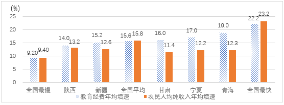 圖1 近年西北五省教育經(jīng)費和農(nóng)民收入年均增速