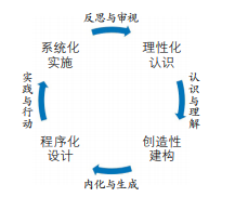 以課程標準向教學的轉化為例,課程標準要轉化為教師的教學實踐,首先必須對課程標準進行認真學習和理解,形成教師對課程標準的理性化認識,并以此為基礎結合教師自身的經驗對課程標準進行內化與生成,實現對課程標準的創(chuàng)造性建構。在此基礎上,教師結合具體的教育情境,對內化了的課程標準進行程序化的教學設計,形成具體的操作方案,并依據操作方案在課堂教學中進行系統(tǒng)化實施。課程標準向教學的轉化是一個螺旋上升的過程,實施不是本次轉化的終點,而是新一輪轉化的起點。由此,課程標準實現了其向教學的持續(xù)轉化。
